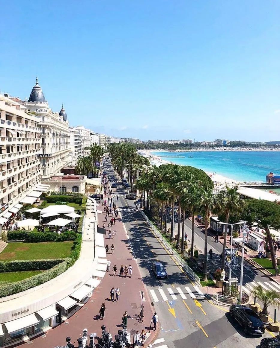 戛纳节庆宫外的海滨漫步大道——十字大道(la Croisette),全长不到3公里,连接戛纳老港(le Vieux-Port) 和著名的戛纳游艇展水上展位区——皮埃尔-康朵(Pierre-Canto)港。漫步在十字大道上,一边是细沙滩和地中海风光,一边是奢侈品店铺、奢华酒店和赌场。