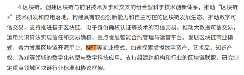 关于当下前沿的元宇宙、NFT、区块链等领域,规划也有具体涉及。其中元宇宙和区块链的规划专门设立了段落进行具体阐述。