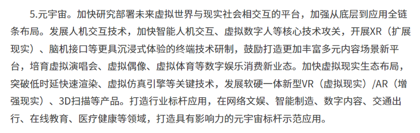 关于“元宇宙”,在“提升数字新基建”部分中,规划称要加快研究部署未来虚拟世界与现实社会相交互的平台,加强从底层到应用全链条布局。发展人机交互技术,加快智能人机交互、虚拟数字人等核心技术攻关,开展XR(扩展现实)、脑机接口等更具沉浸式体验的终端技术研制,鼓励打造更加丰富多元内容场景新平台,培育虚拟演唱会、虚拟偶像、虚拟体育等数字娱乐消费新业态。加快虚拟现实生态布局,突破低时延快速渲染、虚拟仿真引擎等关键技术,发展软硬一体新型VR(虚拟现实)/AR(增强现实)、3D扫描等产品。打造行业标杆应用,在网络文娱、智能制造、数字内容、交通出行、在线教育、医疗健康等领域,打造具有影响力的元宇宙标杆示范应用。