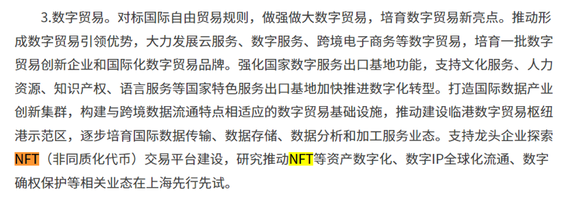 在规划中,三次提及NFT,具体包括:在“培育数据新要素”部分的“数字贸易”方面,规划提出要支持龙头企业探索NFT(非同质化代币)交易平台建设,研究推动NFT等资产数字化、数字IP全球化流通、数字确权保护等相关业态在上海先行先试。