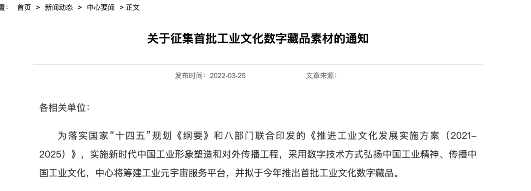 据工业和信息化部工业文化发展中心官网,近日发布《关于征集首批工业文化数字藏品素材的通知》。为落实国家“十四五”规划《纲要》和八部门联合印发的《推进工业文化发展实施方案(2021-2025)》,实施新时代中国工业形象塑造和对外传播工程,采用数字技术方式弘扬中国工业精神、传播中国工业文化, 工业和信息化部工业文化发展中心将筹建工业元宇宙服务平台,并拟于今年推出首批工业文化数字藏品。