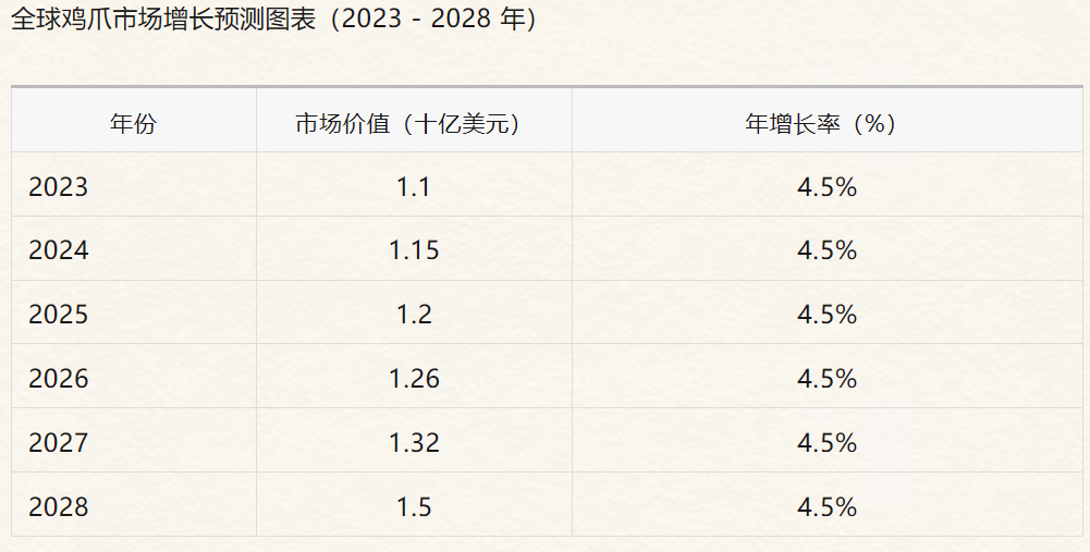 根据GrandViewResearch的一份报告,到2028年,全球鸡爪市场价值有望达到15亿美元,2023年至2028年的复合年增长率为4.5%。